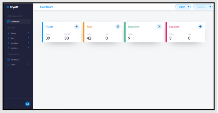Once logged in, you will land on the Dashboard where you will find Assets (total and tagged), Tags (total and live), Locations (total) and Locators (total and live).