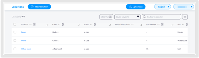 Clicking on the “Locations” tab on the "List Views” panel, depending on your “Access Level”, you can see the locations list with information like Location, Code, Status, Assets on Location, Surface Area, Site, etc.