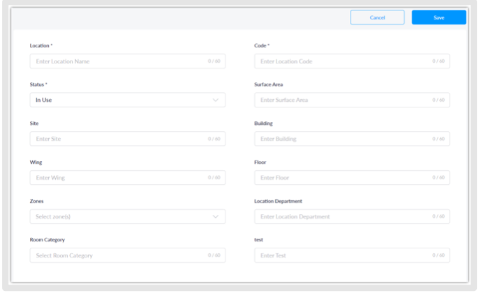 Here you can add the locations where you expect to install locators and track equipment. In addition to the name and code, you can add more detailed information like Floor, Wing, Building, etc.