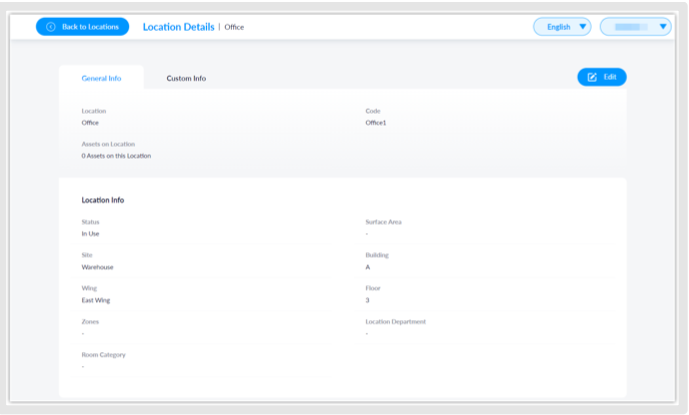 - “Location Info” - Here you can find Status, Surface Area, Site, Building, Wing, Floor< Zones, Location Department, Room Category.