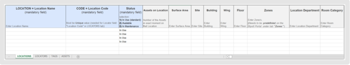 For accelerated onboarding, we created a simple shortened table called “Onboarding Excel Table” with minimal data which is needed to jump-start the setup and creation of client accounts. Here you can add essential data like Locations, Locators, Tags, and Assets and forward the table to the support team to import it for you.