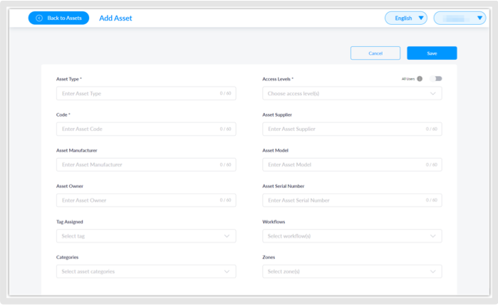 “Asset Type” - Name of the Asset specify the name of the equipment you want to add to the platform. For example, “Wheelchair” or “Monitor”.