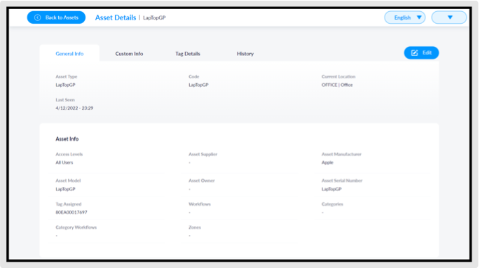 “General Info” - Here you can find Asset Type, Code, Current Location, Last Seen.