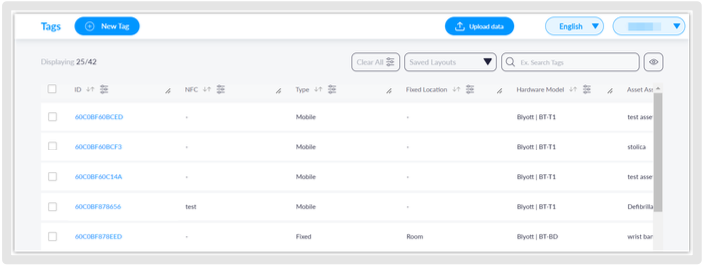 Clicking on the “Tags” tab on the “List Views” panel, depending on your “Access Level” you can see tags list with information like ID, NFC, Type, Fixed Location, Hardware Model, Asset Assigned, etc.