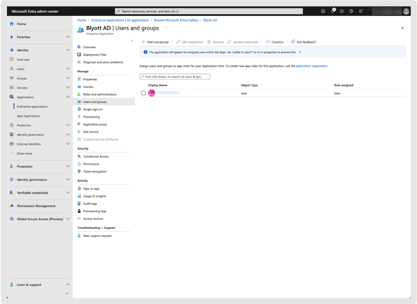 Add the relevant users in AD to each group. Ensure that these groups have access to the AD Enterprise application created for the AD <> Blyott integration, and that no other users/groups have access.