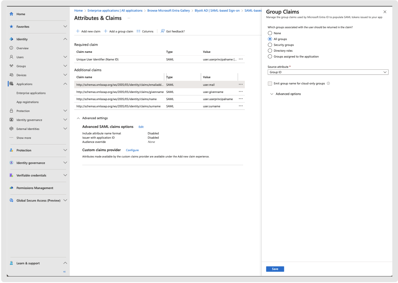 Forgetting to add group claims in the SAML setup can result in users not being recognized by the Blyott system. Always include all necessary group claims during the SSO – SAML setup. -