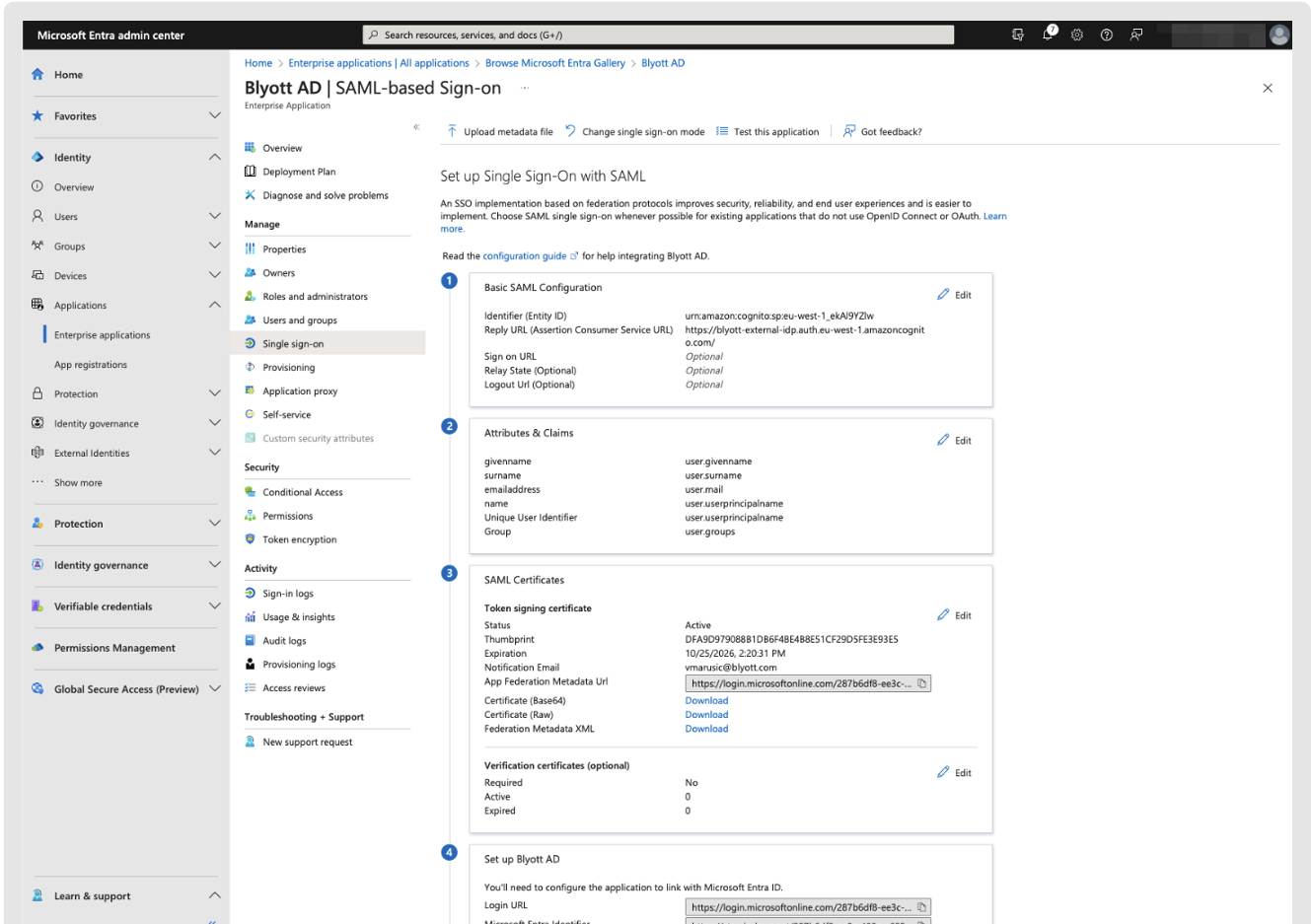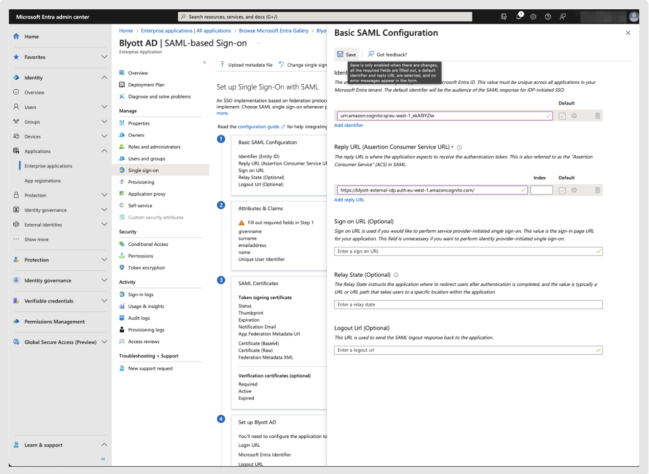 Identifier (Entity ID): urn:amazon:cognito:sp:eu-west-1_ekAl9YZlw Reply URL (Assertion Consumer Service URL): https://blyott-external-idp.auth.eu-west-1.amazoncognito.com