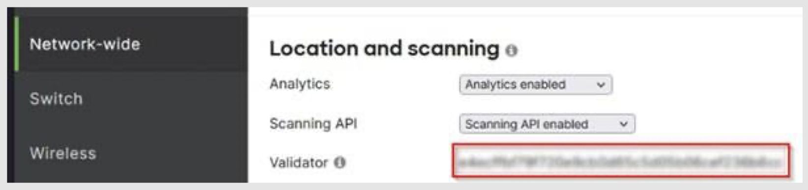 The Validator key can be found in the Meraki portal > Network‐wide > Location and scanning > Validator