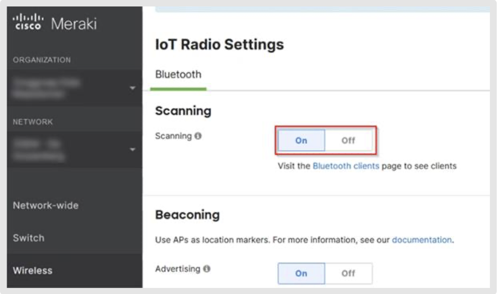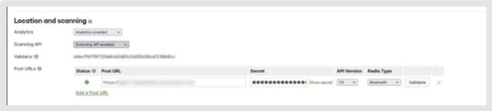 Enable the Location and scanning service. This system will transfer the BLE-scanned data to the Locator proxy server. The settings can be found via Network‐wide > Location and scanning.