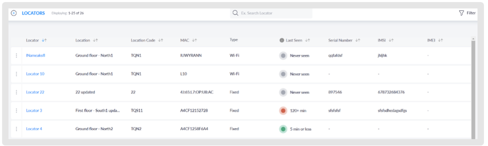 While on Blyott Dashboard, clicking on “Locators” tab on the “List Views” panel, depending on your “Access Level”, you can see locators list with information like Locator Name, Location, Location Code, MAC, Type, Last Seen, Serial Number, IMSI, IMEI.