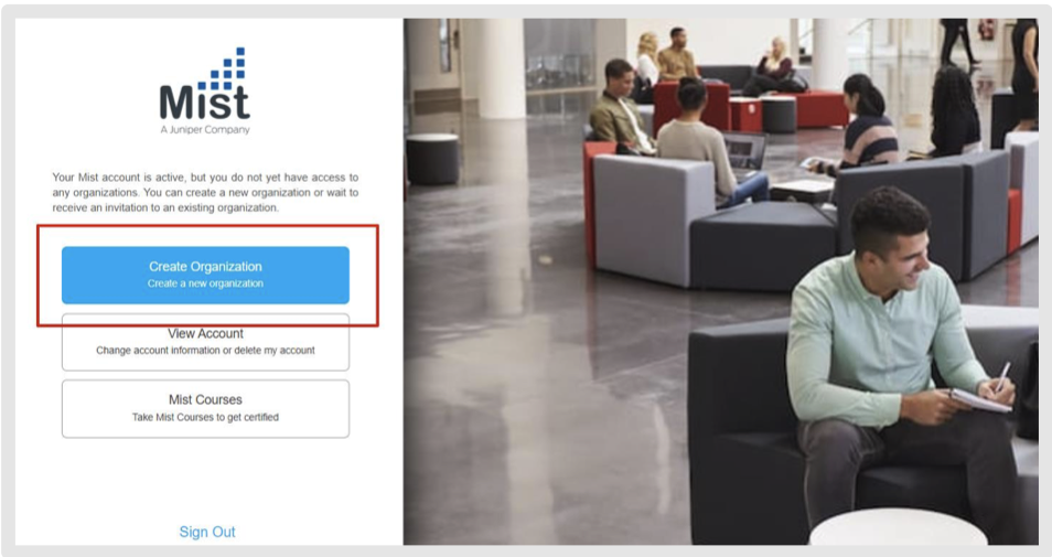 After you have created the account on manage.mist.com and ensured your MIST AP device is powered and ready, sign in and proceed to create an "Organization":