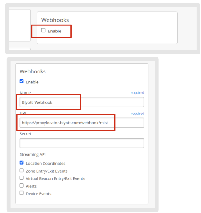 Fill the following Blyott endpoint „URL“: https://proxylocator.blyott.com/webhook/mist