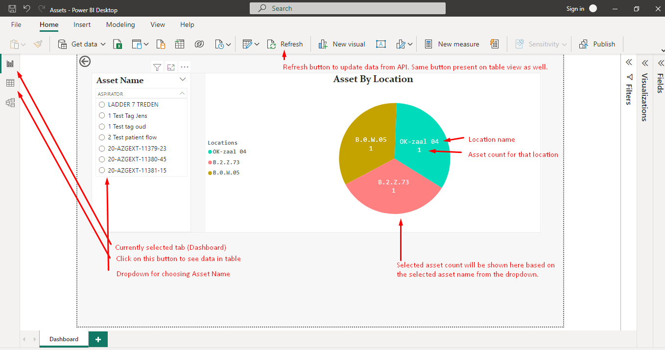 - There is also a pie chart that displays the number and percentage of asset types in a selected location. This chart also updates every time when a field selection changes.